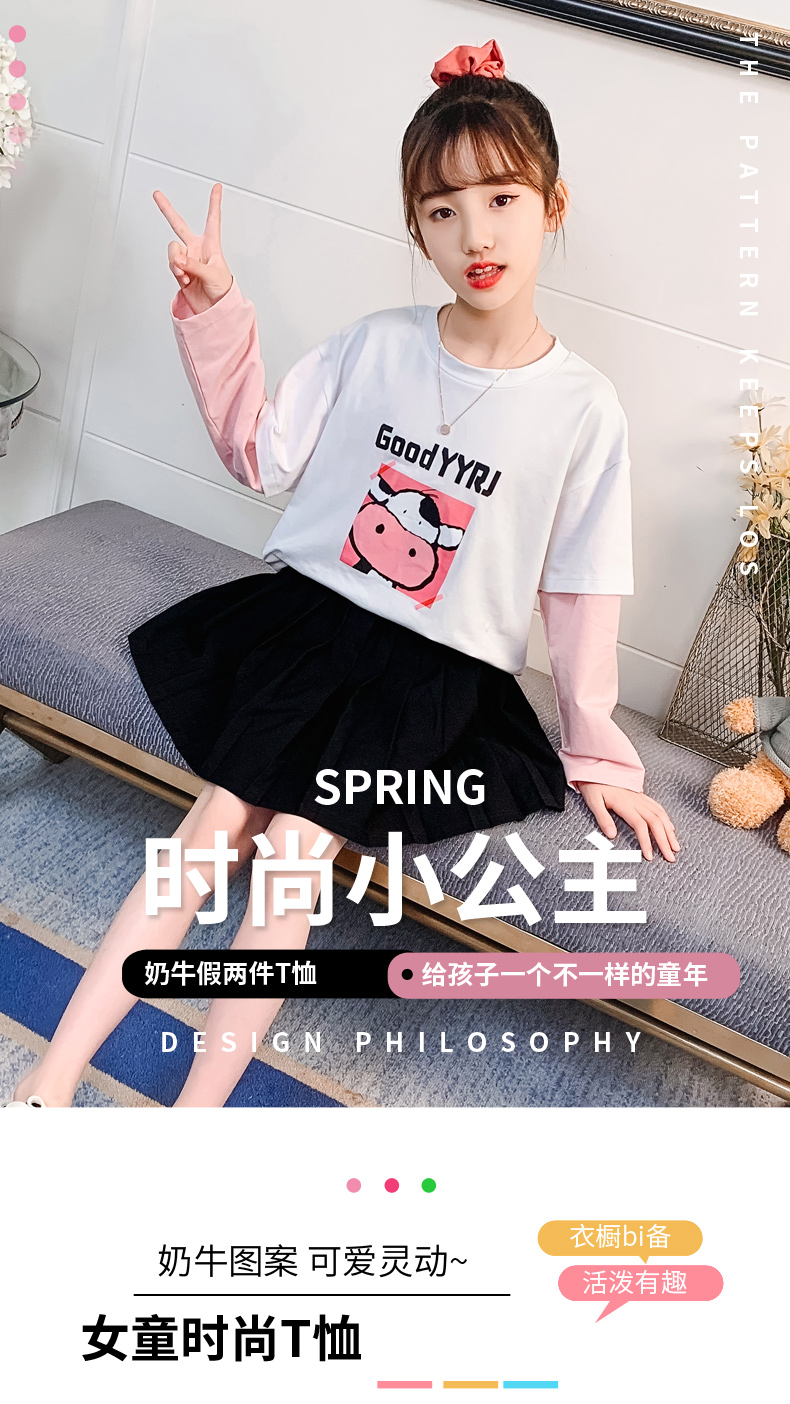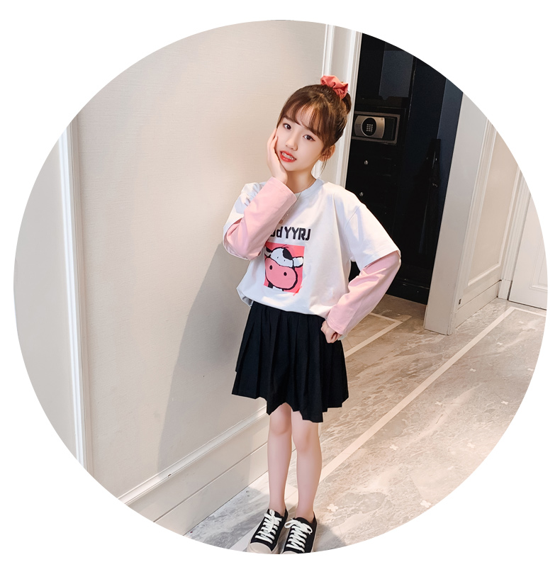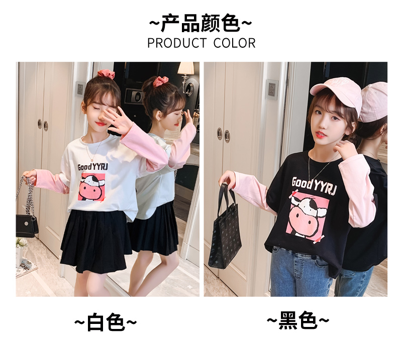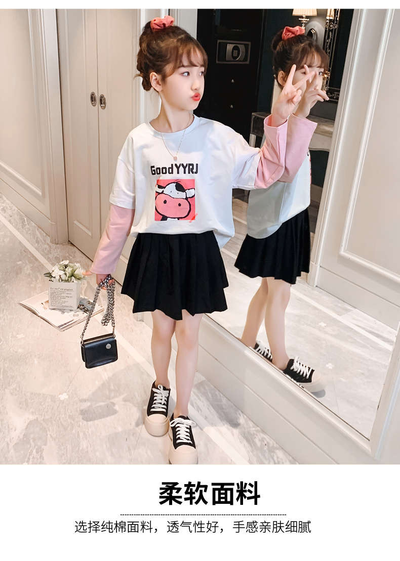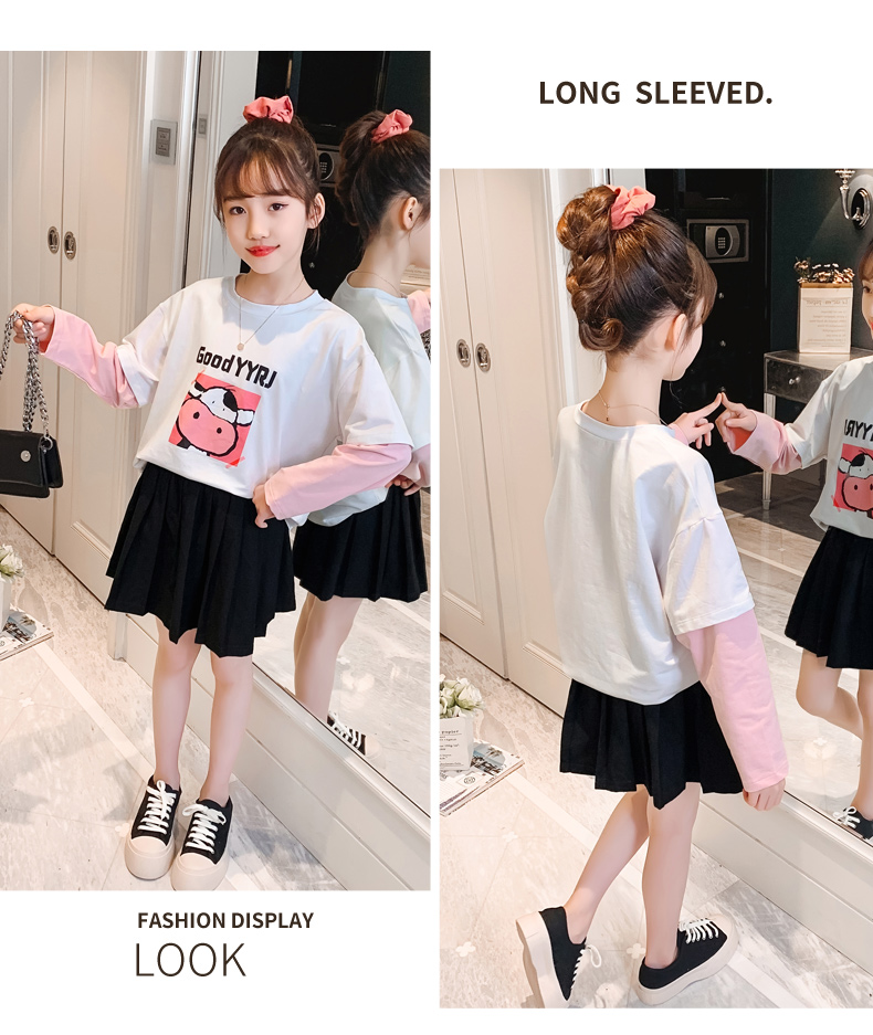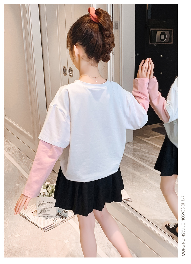 女童春夏2021新款洋氣潮流假兩件白色長(zhǎng)袖T恤休閑時(shí)髦兒童上衣女