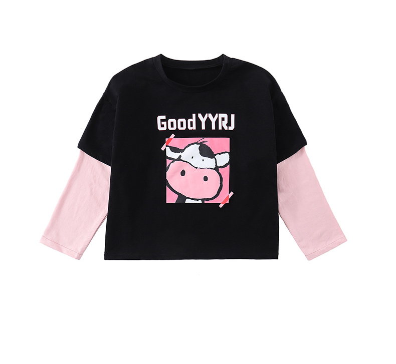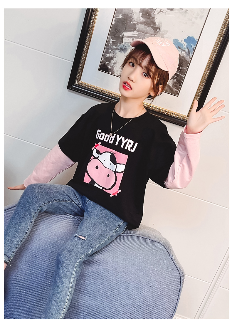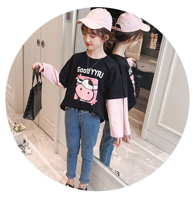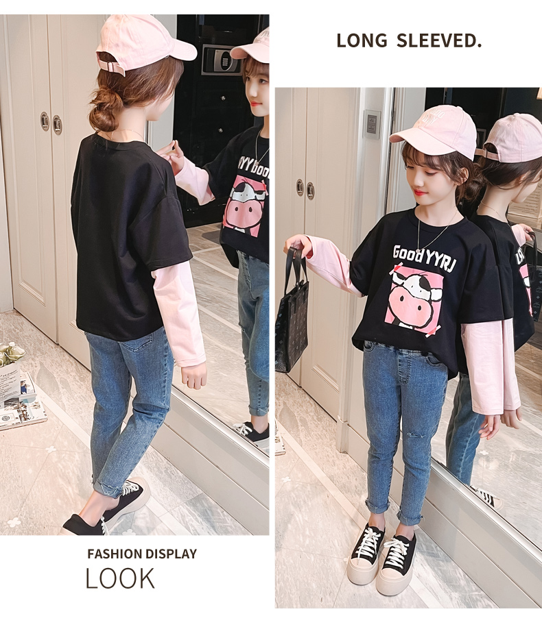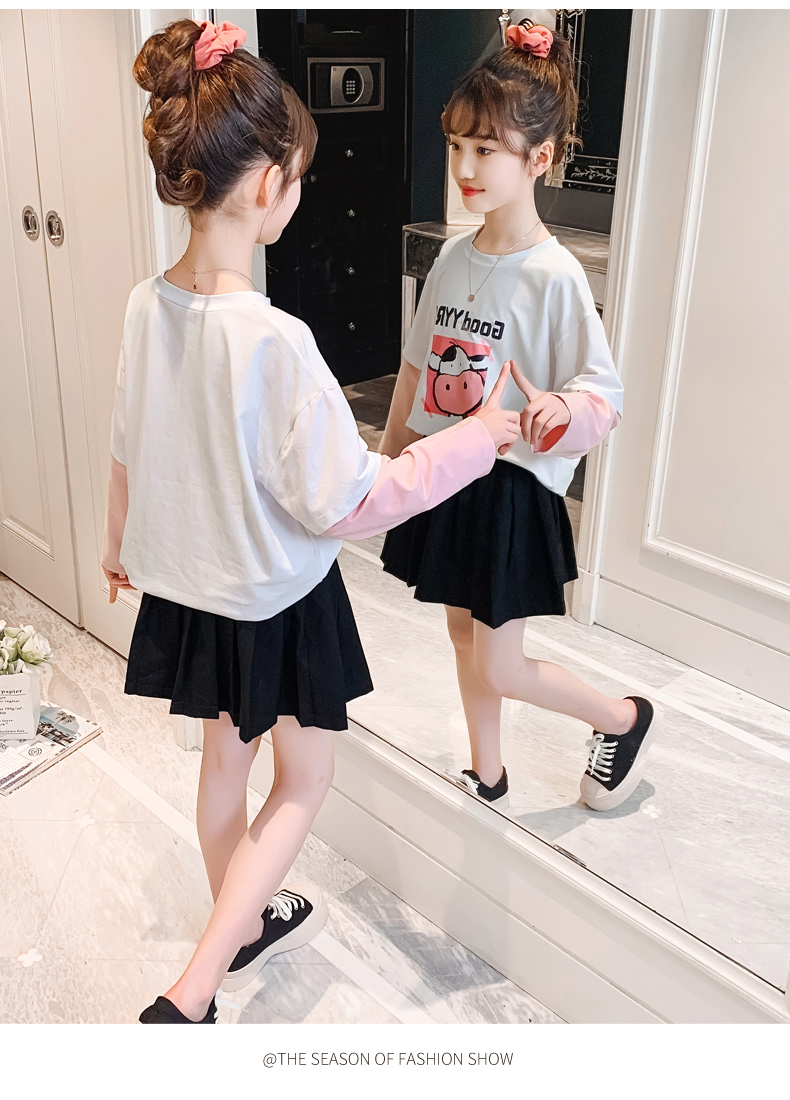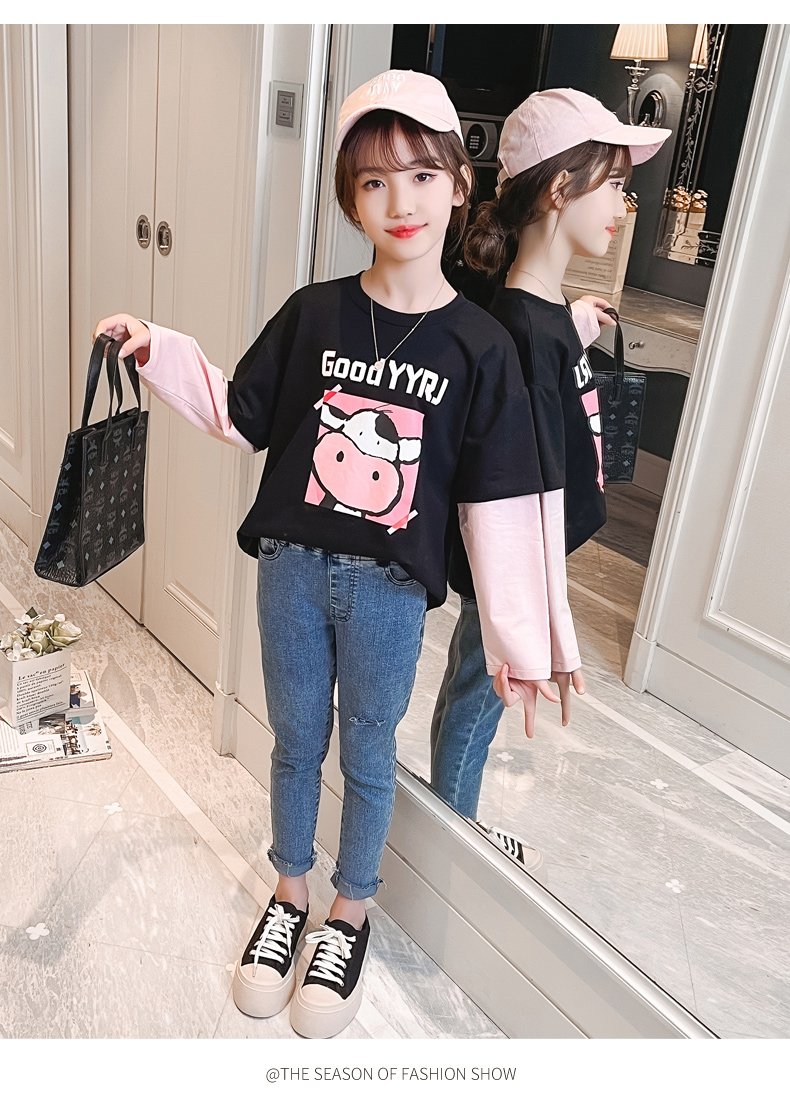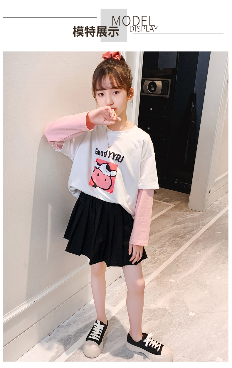 女童春夏2021新款洋氣潮流假兩件白色長(zhǎng)袖T恤休閑時(shí)髦兒童上衣女