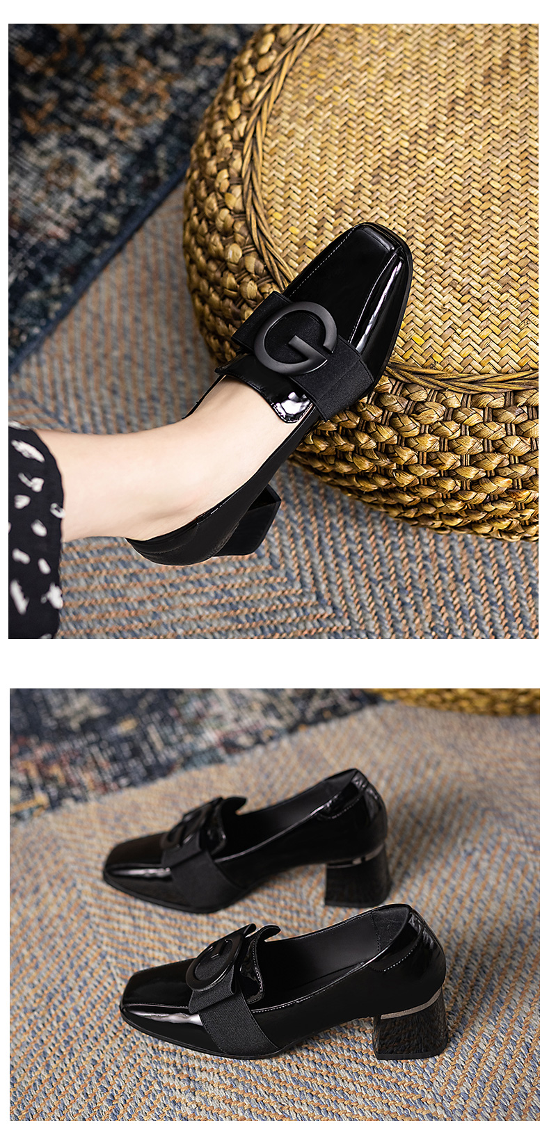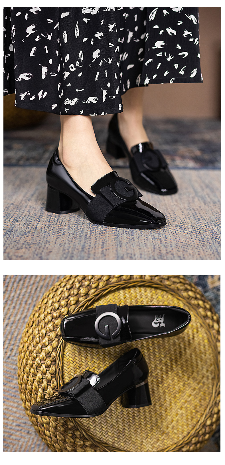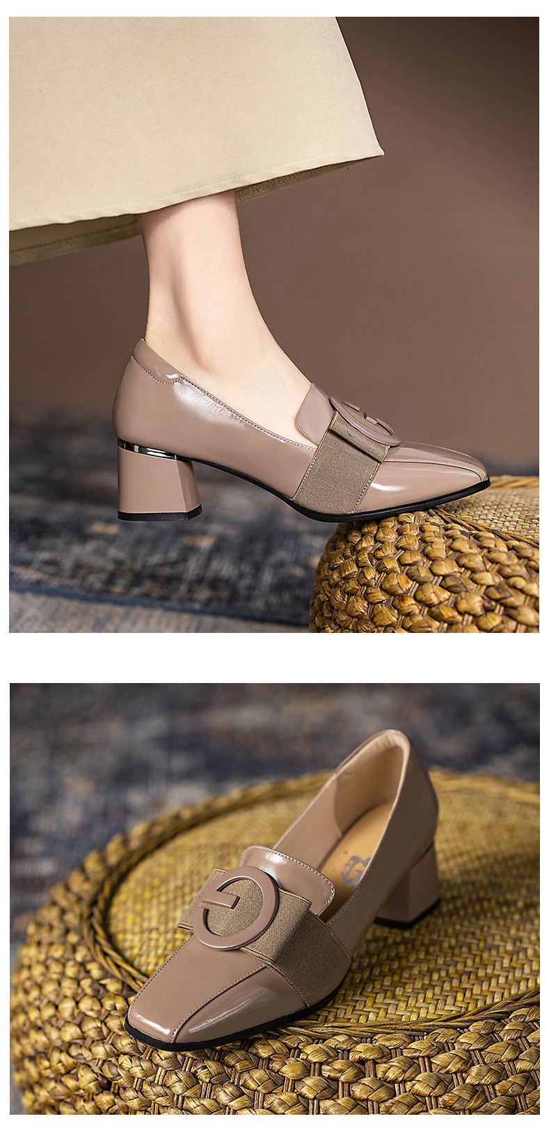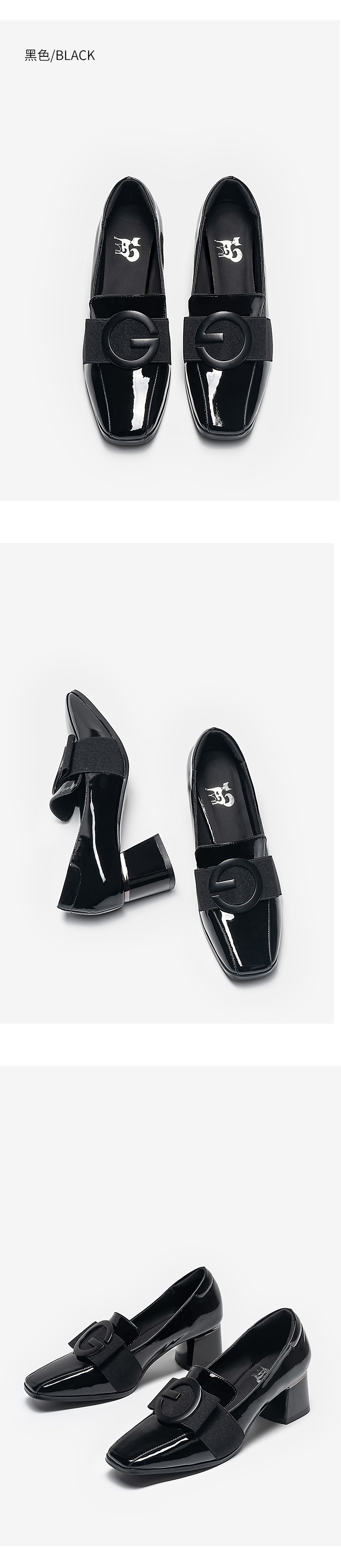 浪莎粗跟單鞋女2021早春女鞋一腳蹬小皮鞋中跟方頭深口真皮樂福鞋